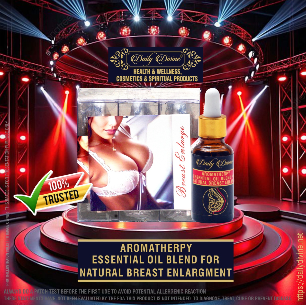 ALWAYS DO A PATCH TEST BEFORE THE FIRST USE TO AVOID POTENTIAL ALLERGENIC REACTION.THESE STATEMENTS HAVE NOT BEEN EVALUATED BY THE FDA. THIS PRODUCT IS NOT INTENDED TO DIAGNOSE, TREAT, CURE OR PREVENT DISEASE.